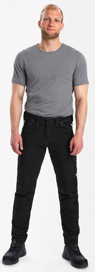 Functional craftsman trousers with a modern fit and many practical details. Optimum fit with ergonomically shaped knee area. 4-way stretch ensures a better fit and greater freedom of movement. These trousers are lined with cotton on the inside for maximum comfort. The D-ring on the front can be used to attach an ID card, for example. Two spacious slanted front pockets. Two back pockets. Two thigh pockets with zippers. The left thigh pocket has an extra cell phone pocket and the right thigh pocket has additional dividers. Buttons for easy attachment of hanging pockets. Two wide Velcro straps on the waistband for quick attachment of a tool holder. Knee reinforcement/knee pocket with Velcro fastener at the bottom and two adjustment options for adjusting the height of the knee pad. Knee reinforcement made of hard-wearing CORDURA®. Wide bottom hem that can be left out if extra leg length is required. Only one seam needs to be undone to lengthen the trousers. The trouser leg is still hemmed