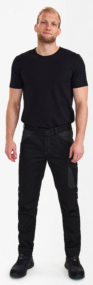 Two-tone work trousers with a modern cut that place great emphasis on functionality and a good fit. The work trousers are made from a fabric that is comfortable to wear in both warm and cold temperatures. The trousers have pre-shaped knees for maximum freedom of movement and a practical elasticated waistband at the back, which ensures a good fit and prevents the trousers from slipping during repetitive movements. The work trousers were developed with the industry in mind. They have all the necessary functional details as well as additional details that make them suitable for other sectors. The work trousers have a particularly large number of functional pockets, such as two spacious slanted front pockets. Back pocket with Velcro fastener. Thigh pocket with flap and separate cell phone pocket on the left side. On the right side there is a ruler pocket with loose hanging bottom and reinforcement. The trousers have 2 adjustment options for the insertion of knee pads and additional reinfor
