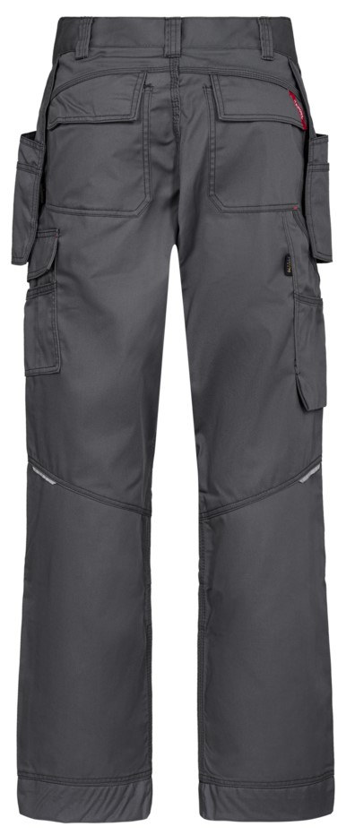 Functional craftsman trousers with contrasting topstitching. Optimum fit, ergonomically shaped knees. Two spacious, slanted slit pockets and two holster pockets at the front. Two back pockets with flap. Thigh pocket with flap and inserts for pens, for example. Free-hanging, reinforced folding rule pocket with extra compartments guarantees optimum freedom of movement. Adjustable hammer loop. Reinforced knee pockets with two adjustment options for knee pads. Reinforced hem on trouser legs for extra wear resistance. High visibility thanks to reflective piping in the middle of the back of the trouser legs. The pants have an extra wide turn-up so that the crotch length can be extended if required. For additional leg length, only one hem needs to be unzipped, behind which there is an additional hem.