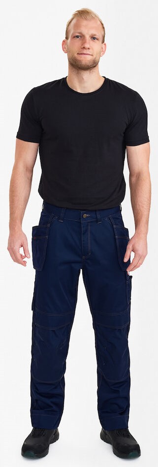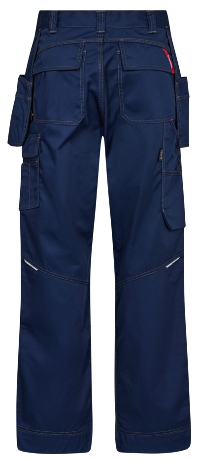 Functional craftsman trousers with contrasting topstitching. Optimum fit, ergonomically shaped knees. Two spacious, slanted slit pockets and two holster pockets at the front. Two back pockets with flap. Thigh pocket with flap and inserts for pens, for example. Free-hanging, reinforced folding rule pocket with extra compartments guarantees optimum freedom of movement. Adjustable hammer loop. Reinforced knee pockets with two adjustment options for knee pads. Reinforced hem on trouser legs for extra wear resistance. High visibility thanks to reflective piping in the middle of the back of the trouser legs. The pants have an extra wide turn-up so that the crotch length can be extended if required. For additional leg length, only one hem needs to be unzipped, behind which there is an additional hem.