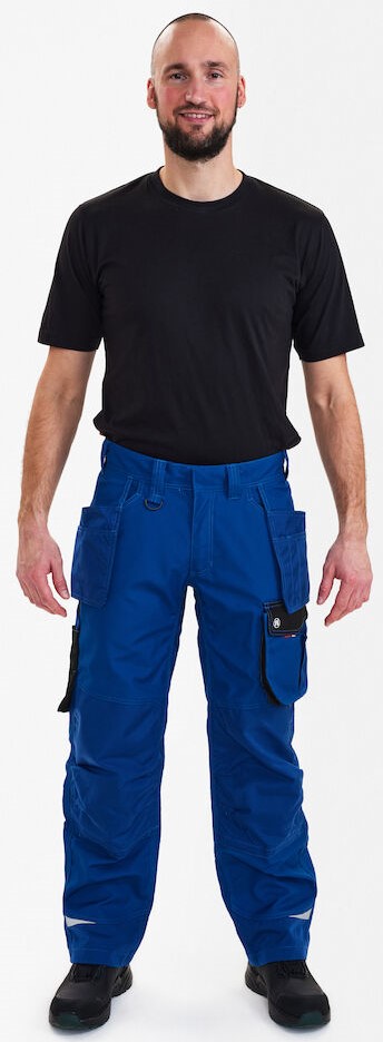 Functional work trousers with many details. Optimum fit, including ergonomically shaped knees and a panel on the inseam in the crotch for greater comfort. Two spacious, slanted slit pockets and two holster pockets at the front. Loop with D-ring (front) for attaching an ID card. Two spacious back pockets with flap and Velcro fastener. Thigh pocket with zipper pocket for cell phone, additional small pocket. It is spacious and provides more freedom of movement thanks to the free-hanging bottom. Reinforced ruler pocket at the bottom with additional compartments. The ruler pocket also has a free-hanging bottom. Knee reinforcement/knee pocket with Velcro fastener at the bottom and two adjustment options for knee pads. Reinforced hem at the back and front of the trouser legs for extra wear resistance. Reflective strips on the knees and at the bottom of the trouser legs for increased visibility. Suitable for industrial laundering.