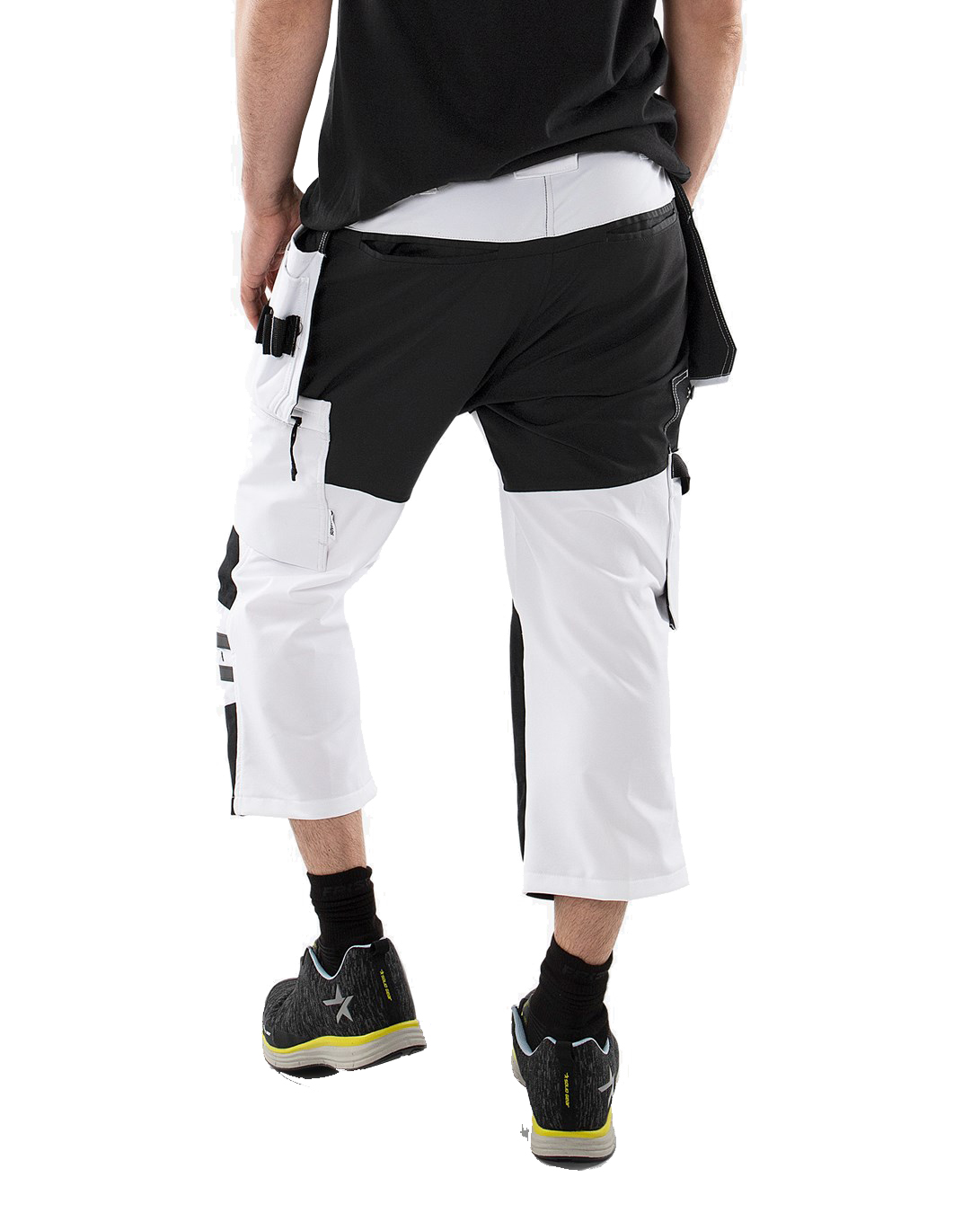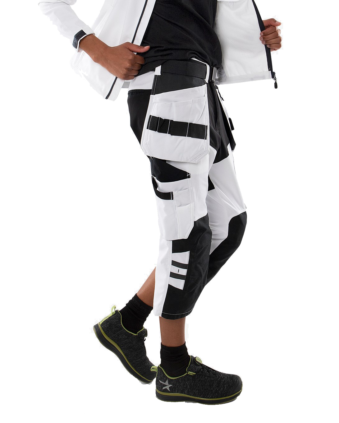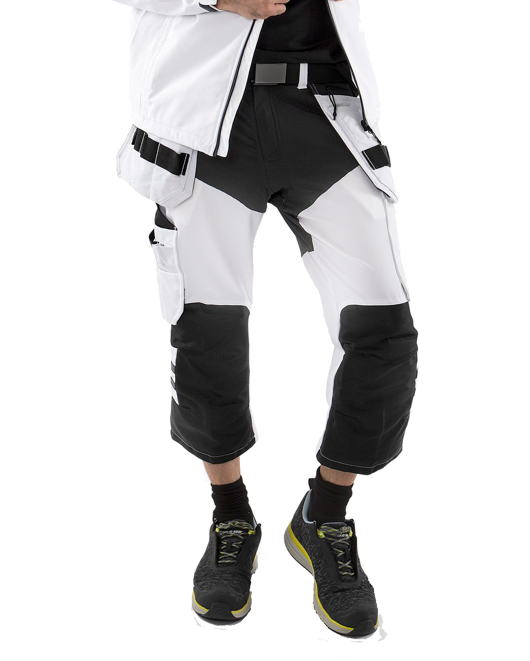 Painter's 3/4 trousers made of 4-way stretch material for high, lightweight comfort and freedom of movement. Fully equipped and reinforced craftsman model with special pockets and functions that offer optimum functionality for painters. Material: Stretch material 92% polyester, 8% elastane Weight: 205 g/m² Sizes: C42-C62 Season: Summer Especially for painters Lightweight 4-way stretch fabric Elastic waist at the sides Concealed front button 2 CORDURA®-reinforced hanging pockets for painting tools with 3 smaller pockets and tool loops, one additional zippered pocket D-ring under the hanging pocket 2 front pockets 2 back pockets, fully lined with CORDURA®, e.g. for tools, sandpaper tools, sandpaper Double reinforced crotch seam Loop with press stud fastener Spacious leg pocket for folding rule and painting tools made of CORDURA®, CORDURA®-reinforced tool and carpet knife pocket, pen pocket and button and loop for knife Leg pocket with press stud fastener and large dust and water-p