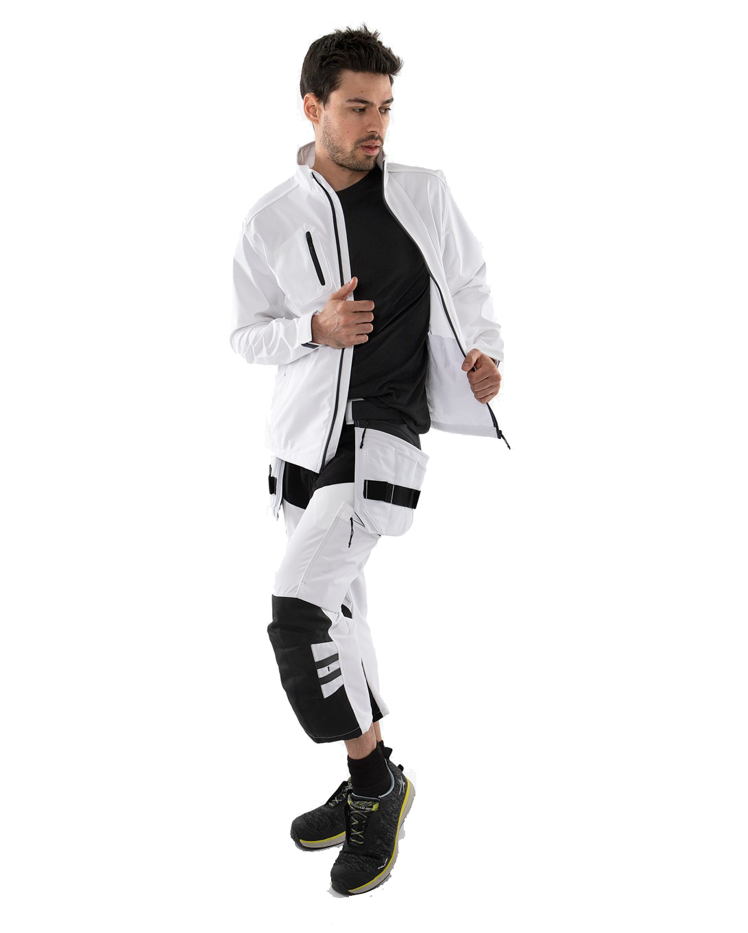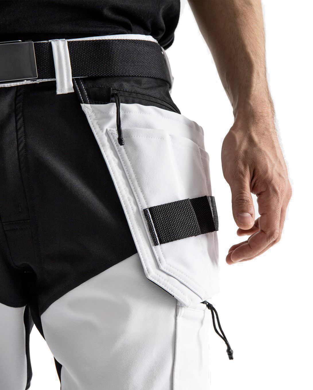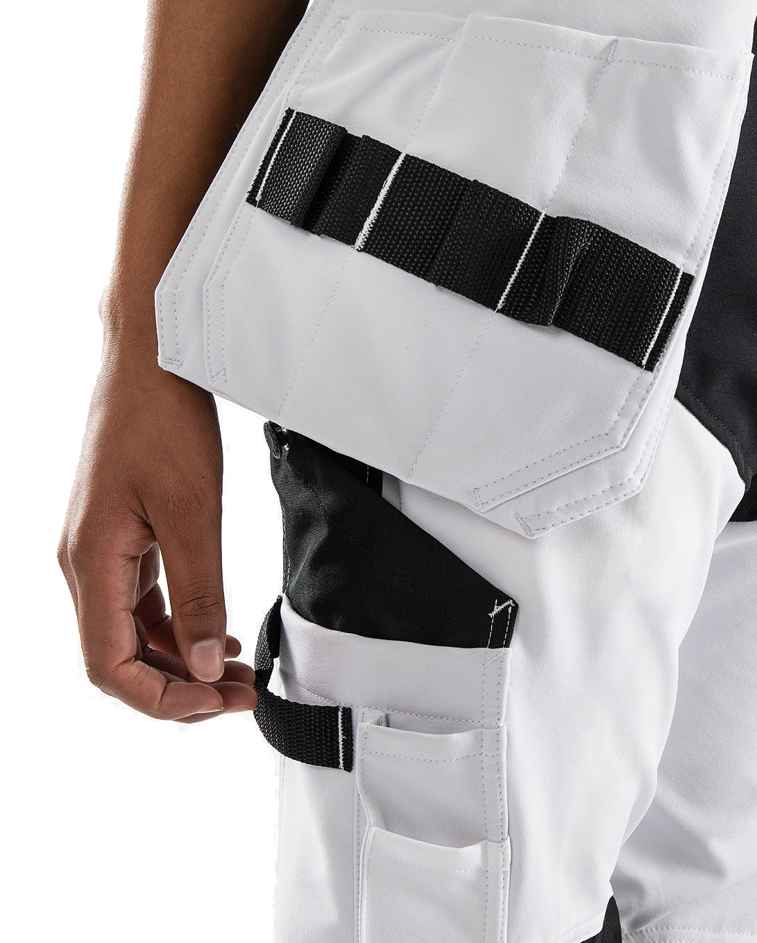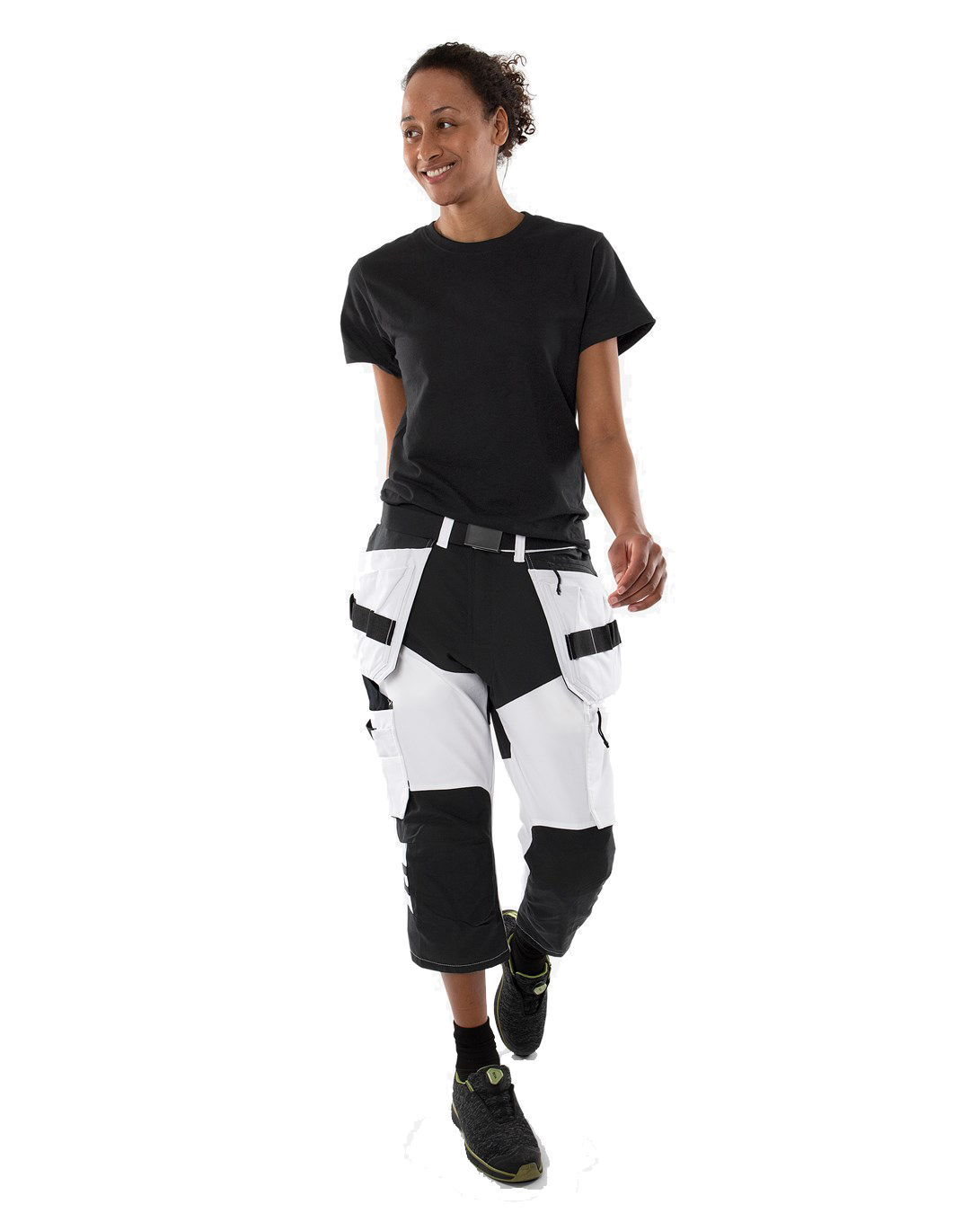 Painter's 3/4 trousers made of 4-way stretch material for high, lightweight comfort and freedom of movement. Fully equipped and reinforced craftsman model with special pockets and functions that offer optimum functionality for painters. Material: Stretch material 92% polyester, 8% elastane Weight: 205 g/m² Sizes: C42-C62 Season: Summer Especially for painters Lightweight 4-way stretch fabric Elastic waist at the sides Concealed front button 2 CORDURA®-reinforced hanging pockets for painting tools with 3 smaller pockets and tool loops, one additional zippered pocket D-ring under the hanging pocket 2 front pockets 2 back pockets, fully lined with CORDURA®, e.g. for tools, sandpaper tools, sandpaper Double reinforced crotch seam Loop with press stud fastener Spacious leg pocket for folding rule and painting tools made of CORDURA®, CORDURA®-reinforced tool and carpet knife pocket, pen pocket and button and loop for knife Leg pocket with press stud fastener and large dust and water-p