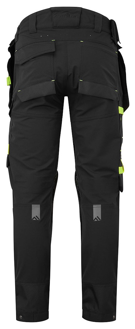 The EV4 Stretch Holster Trouser offers an improved ergonomic design and utilizes the targeted placement of laser-cut vents to ensure maximum ventilation while working. The trousers feature a high back waistband with elasticated sides to provide protection in all working positions. Pre-shaped, top-loading, adjustable knee pad pockets, generously sized front pockets and multifunctional zippered thigh pockets provide secure storage for phones, pens and tools. Triple stitched seams for maximum durability.