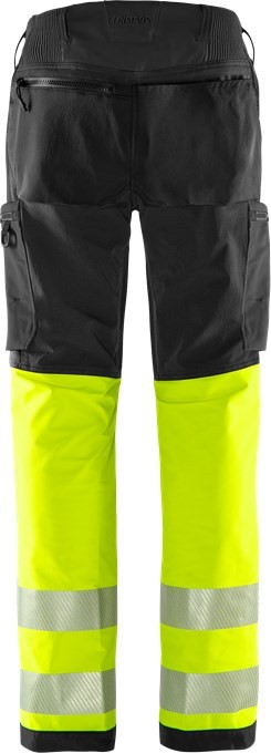Sustainable stretch pants with high visibility, ideal for service and logistics. Full 4-way stretch with rib-knit stretch inserts on waistband for double comfort. Made from bio-based and recycled materials and reinforced in exposed areas. With EPD (Environmental Product Declaration). Standards: EN 20471 high visibility class 1 EN 14404 Knee protection Product description: Material:Stretch fabric 44% PTT (partly bio-based material), 44% polyester, 12% recycled polyester. Ripstop stretch fabric 87% polyamide, 13% elastane. Weight:Stretch fabric 260 g/m². Ripstop stretch fabric 260 g/m². Part of the Fristads Green collection / Sustainable / 4-way stretch fabric / Rib-knit stretch inserts at waistband / Durable ripstop 4-way stretch fabric at seat and back of thighs. Concealed front button / D-ring / 2 front pockets / 2 roomy back pockets, one with zipper / Double reinforced inseam / Roomy leg pocket with snap closure and zipper pocket Leg pocket with snap closure, leg pocket with s