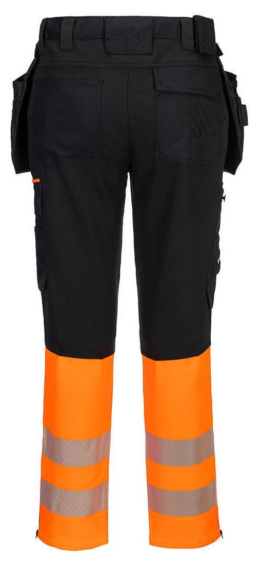 The DX4 high-vis trousers with detachable holster pockets are ergonomically designed and use the targeted placement of dynamic 4-way stretch fabrics to ensure maximum freedom of movement when working. The trousers feature a high back waistband with elasticated sides to provide protection in all working positions. Pre-shaped, top-loading, adjustable knee pad pockets, generously sized front pockets and multifunctional thigh pockets with zippers offer plenty of storage space. Triple seams for maximum durability.