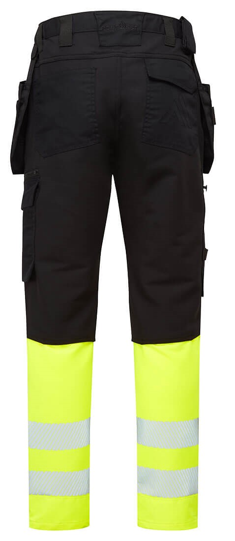 The DX4 high-vis trousers with detachable holster pockets are ergonomically designed and use the targeted placement of dynamic 4-way stretch fabrics to ensure maximum freedom of movement when working. The trousers feature a high back waistband with elasticated sides to provide protection in all working positions. Pre-shaped, top-loading, adjustable knee pad pockets, generously sized front pockets and multifunctional thigh pockets with zippers offer plenty of storage space. Triple seams for maximum durability.