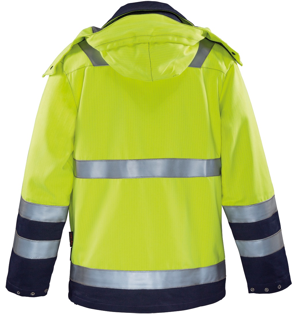 The rofaMULTI NINE Parka meets the standards for high visibility warning clothing, protection against heat and flames, arcs, cold, liquid chemicals and rain. An additional plus is the electrostatic dissipation capability. The reflective stripes around the torso, sleeves and shoulders make the wearer visible all around, even in poor visibility and darkness. The roll-in or removable hood with drawcord, the high-closing stand-up collar and the rain gutter offer optimum protection in inclement weather. In addition, the innovative pocket solutions provide sufficient storage space and can be used individually. Optional with detachable inner jacket 260368,design: stand-up collar with detachable hood, centre front with two-way zip, front strip with press studs and rain gutter, 2 breast pockets with flap and zip, sleeve ends adjustable by press studs, 2 side pockets with flap and zip, Napoleon pocket with zip on left side, waistband adjustable by inside elastic band, 50mm reflective stripes aro