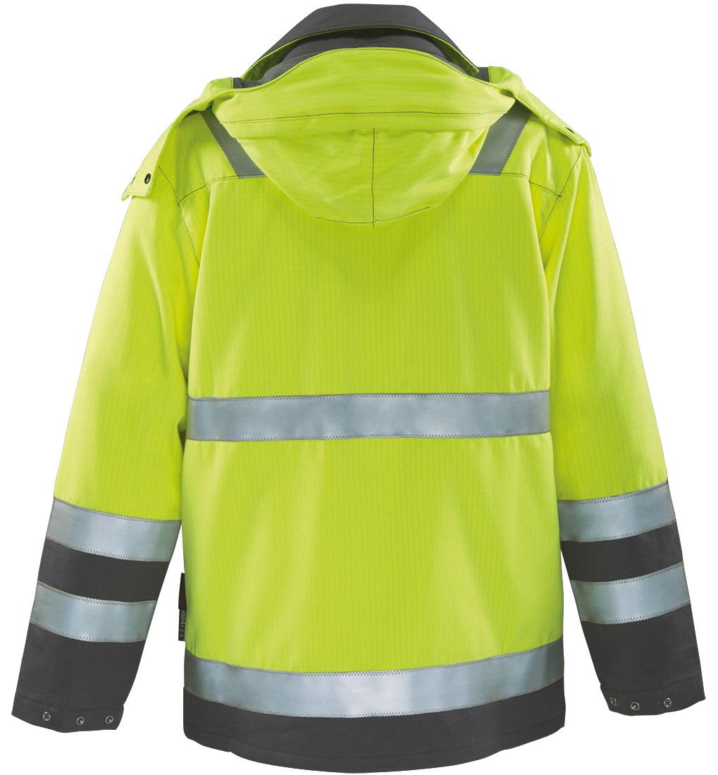 The rofaMULTI NINE Parka meets the standards for high visibility warning clothing, protection against heat and flames, arcs, cold, liquid chemicals and rain. An additional plus is the electrostatic dissipation capability. The reflective stripes around the torso, sleeves and shoulders make the wearer visible all around, even in poor visibility and darkness. The roll-in or removable hood with drawcord, the high-closing stand-up collar and the rain gutter offer optimum protection in inclement weather. In addition, the innovative pocket solutions provide sufficient storage space and can be used individually. Optional with detachable inner jacket 260368,design: stand-up collar with detachable hood, centre front with two-way zip, front strip with press studs and rain gutter, 2 breast pockets with flap and zip, sleeve ends adjustable by press studs, 2 side pockets with flap and zip, Napoleon pocket with zip on left side, waistband adjustable by inside elastic band, 50mm reflective stripes aro