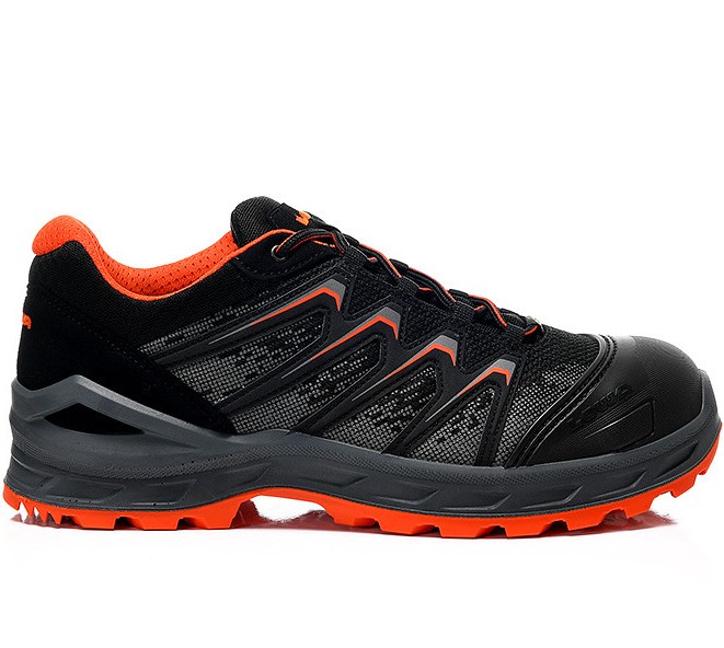 With the LARROX Work GTX black Lo S3 CI, you can be sure of an athlete's safety. The black upper made of hydrophobic textile material is complemented by the GUMMI/PU sole in chic orange. The sporty safety low shoe from our LOWA Work Collection comes with a steel toe cap and metal-free penetration protection. The GORE-TEX membrane also protects against water penetration. The feet stay dry and the shoe climate is permanently and comfortably regulated. Lowest temperatures on the way? No problem, because LARROX is cold-insulating, which means that feet do not cool down too much even in icy cold. Even working in a kneeling position is no problem. A TPU overcap protects against premature wear of the shoe tip and contributes to the durability of the S3 low shoe. The LARROX is available in sizes 39-48.