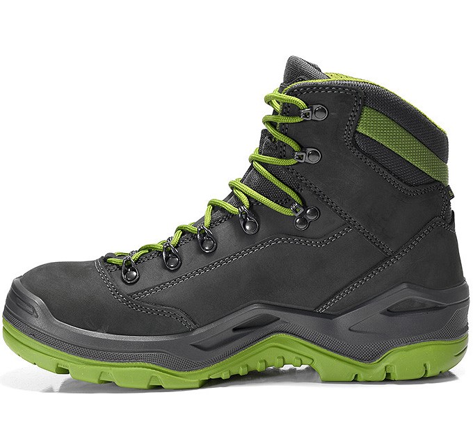 Whether in the Galabau or on the construction site - with the safety boot RENEGADE Work GTX green Mid S3 from the LOWA Work Collection, the wearer leaves an impression everywhere. The boot with eye-catching green highlights not only impresses with its modern and sporty look, but also has everything a safety boot needs for demanding outdoor activities. Robust upper material made of hydrophobic nubuck leather and textile material, which withstands the challenges of wind and weather, as well as an inner lining made of GORE-TEX membrane, which ensures a balanced climate in the shoe. The profile of the safety professional is rounded off with the fresh green GUMMI/PU outsole from VIBRAM®, which is SRC certified and takes excellent account of the various demands of outdoor workplaces. The inserted steel toe cap and steel midsole ensure that hazards from above and below cannot harm the foot. Available in sizes 39 to 47.