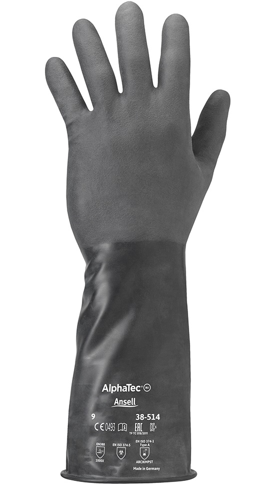 The AlphaTec® 38-514 38-520 38-628 - series offers - without compromising mobility and wearing comfort - optimal protection when handling almost all aggressive chemicals. AlphaTec® Butyl 38-514 and 38-520 offer effective protection against aldehydes, ketones and esters as well as concentrated mineral acids. AlphaTec® 38-628 Viton®/Butyl provides effective protection against aliphatic, halogenated and aromatic hydrocarbons (benzene, toluene, xylene) as well as concentrated mineral acids. AlphaTec® 38-514 38-520 38-628 (EX ChemTek™) models are amazingly flexible and offer excellent dexterity. Natural, anatomical fit, soft, flexible material, excellent grip and easy on and off: ChemTek™ is designed for maximum comfort. The risk of latex allergy is eliminated because ChemTek™ gloves are free of latex proteins.