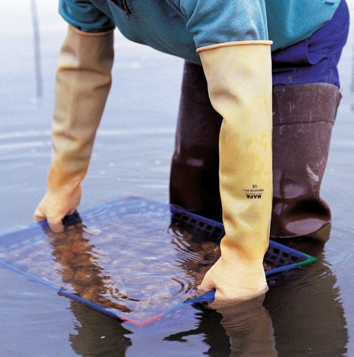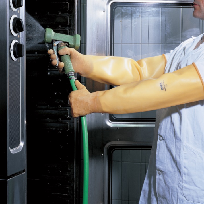 Increased protection during heavy work in damp areas. High mechanical resistance and long-term protection against chemicals. Better durability due to high wall thickness. Chlorinated inside and outside. Easy to put on and take off. Strong profile for very good grip. Protection of forearm by extra long cuff. Good fit on the arm due to rolled edge. Applications: Agriculture, fish farming and trade, tannery, fertilizer production, production and transport of building materials, sandblasting, industrial cleaning.