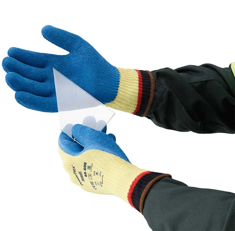 Ansell's ActivArmr® 80-600 (Ex Powerflex®) is the ideal solution for safe handling of glass, metal and plastics. This glove provides excellent cut protection, high overall durability and optimum comfort. The cut protection of the Ansell ActivArmr® 80-600 (Ex Powerflex®) complies with the very high level 4 of EN388. This high ratinghas been achieved by using a knitted Kevlar® linerand a natural rubber latex dip coating. This newly developed coating also offers high abrasion, tear and puncture resistance. The shrink-roughened profile of the latex coating gives the glove an exceptionally secure wet and dry grip. The ActivArmr® 80-600 (Ex Powerflex®)is silicone-free and therefore does not leave fingerprints on metallized glass for thermal insulation. Surfaces remain clean and additional cleaning is therefore avoided.