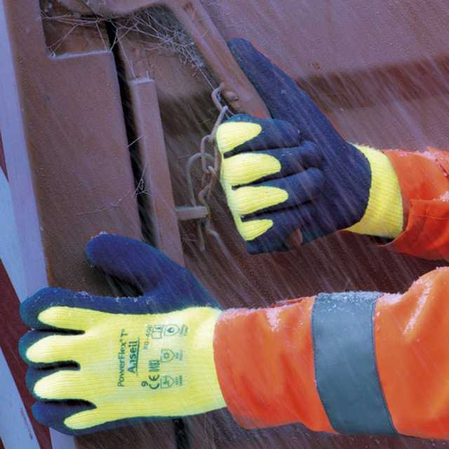 Ansell's Powerflex® 80-400 is a versatile glove with excellent cold insulation, comfort and grip. It combines a thermo-insulating acrylic loop fabric lining with the natural insulating properties of the latex coating to provide effective protection against the cold. This glove guarantees the user both comfort and protection against the cold down to approx. -30° C. during short-term contact. The bright yellow colour of the acrylic loop fabric makes the Powerflex® 80-400 highly visible in low light conditions. This visibility increases work safety in outdoor areas, especially when darkness falls.