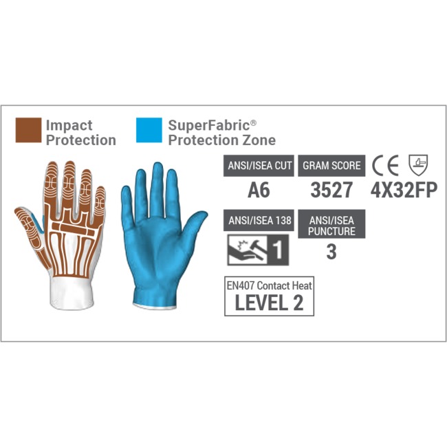 SuperFabric®* brand material palm provides ANSI/ISEA cut level A6 resistance for some of the highest cut protection available in the industry (interior layer)