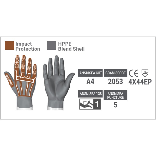 Knitting: 13-gauge HPPE shell and glass blend provides 360° protection according to ANSI/ISEA cut protection level A4