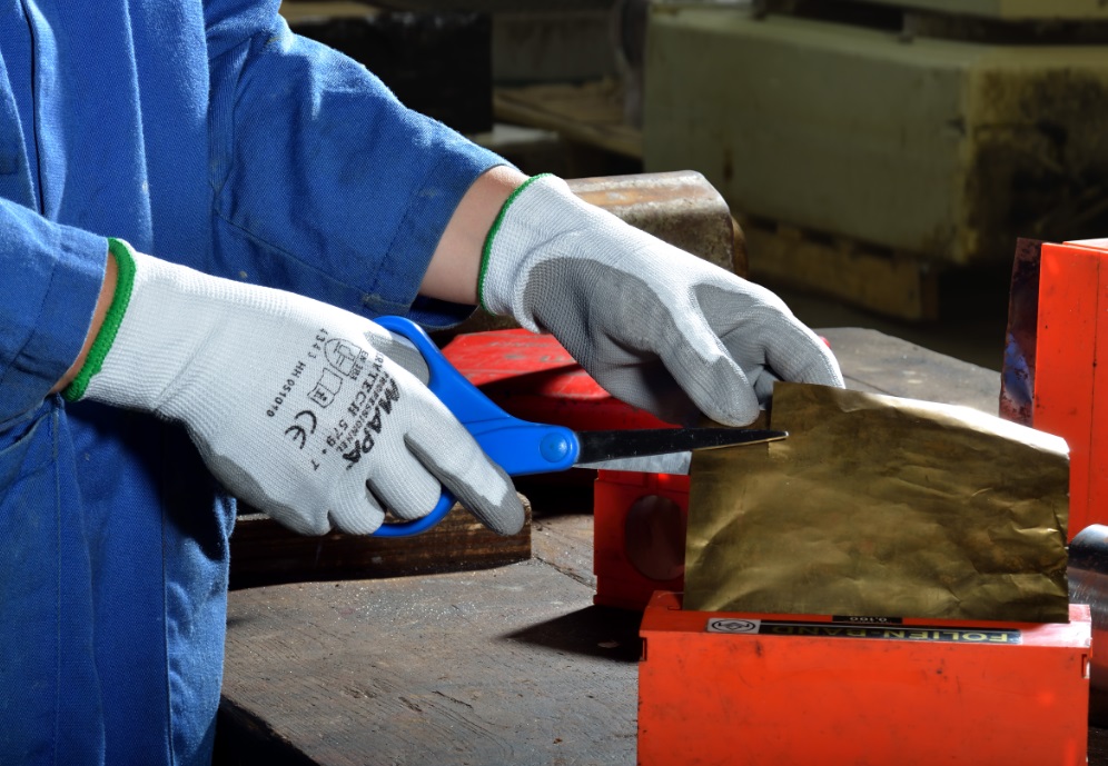 The MapaKrytech 579 is an extremely flexible cut protection glove (Level 3). Seamless knitted, elastic knitted cuffs. The polyurethane coating on palm and fingers, the back of the hand is uncoated. Goode Abristrength for long service life. Excellent dexterity. Reduced hand fatigue due to ergonomic design. Very good tactile sensitivity due to the fine material (579). Silicone-free. Application Mechanical industry (handling of metallic parts, assembly of thin metal sheets, finishing of sharp-edged parts), handling of cardboard boxes/paper/cardboard.