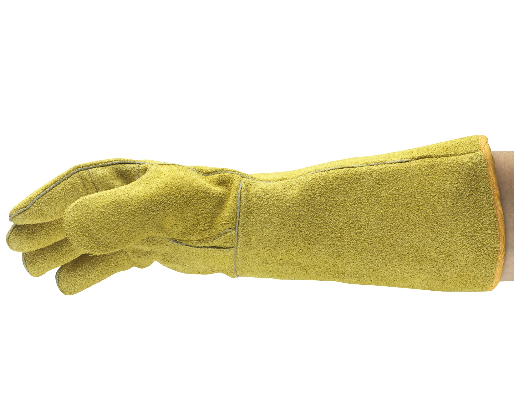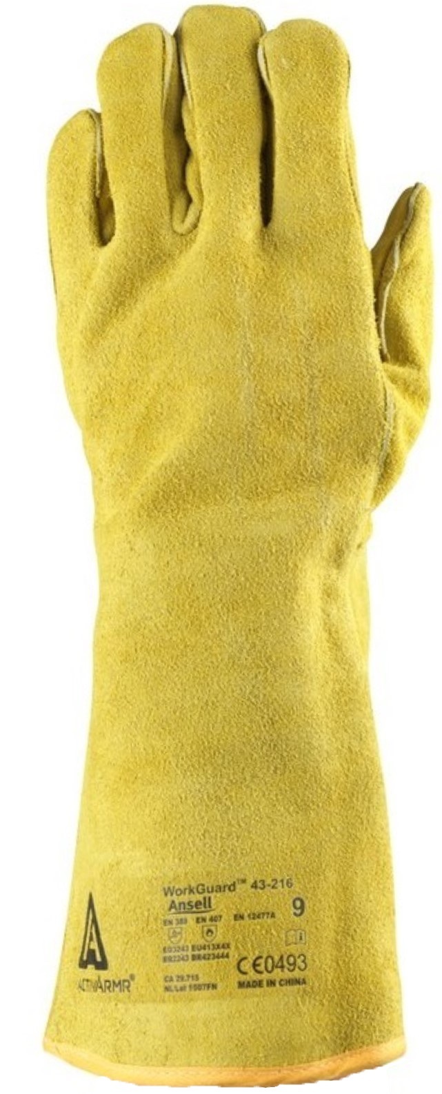The ActivArmr WorkGuard™ 43-216 is a special glove for heavy work with high protection against molten metal splashes. Also ideal as versatile heat protection. Excellent durability and very good protection against cuts, abrasion and punctures. Heat protection in many work areas. It is a category III heat protection glove and meets performance levels 413X4X in accordance with EN 407, making this glove suitable for a wide range of applications requiring heat protection such as welding, machine guiding and working in an environment with a molten metal splash hazard. The soft jersey palm lining and cotton denim lined cuff give it its high level of comfort. Excellent robustness for effective mechanical protection. Robust leather glove for high loads. Reinforced palm for even greater abrasion resistance. Kevlar® stitching, reinforced with cowhide leather. This design ensures superior mechanical protection.
