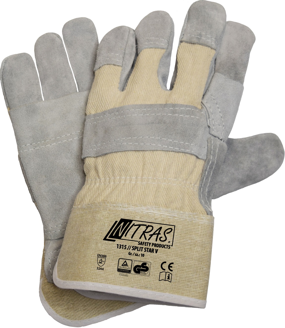 NITRAS SPLIT STAR V, cow split leather gloves, cotton back, natural color, cow split leather, grey, palm lining, rubberized cuff, double seams, reinforced with large split leather palm trim incl. thumb and index finger, trim extends to the fingers