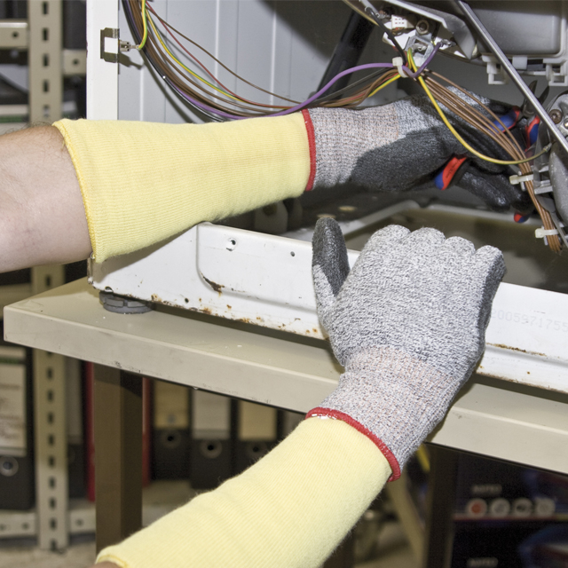 Armex is an arm protector in different lengths: 360 mm and 420 mm. It consists of 100% para-aramid and is made of double-layered fabric. The fine knit allows the finest work to be carried out without sacrificing a high degree of cut protection in the palm, forearm and pulse areas. The thumb hole provides a good fit and support and does not interfere with work. Armex can also be ideally combined with other cut or heat protection gloves. Due to the fabric it is breathable and allows long fatigue-free working with good heat protection up to 100°C. The glove can be cleaned several times without losing its protective properties. Detailed washing instructions are available. Armex is suitable for any hand, regardless of hand size.Areas of application Metal and plastics industry, e.g. aircraft construction, automotive industry in the assembly sector, steel and aluminium rolling mills in the sheet metal production sector, all activities with cutting or heat hazards for the forearms. Standard: