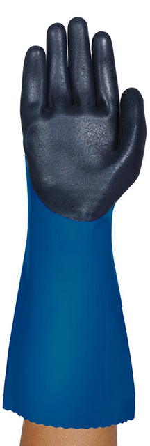 Special nitrile/PVC blend for increased durability, protective performance and flexibility. PVC chemical protective glove certified according to EN ISO 374:2016, type A. High durability and flexibility even at low temperatures. Additional 5 test chemicals (AFNOS) achieve at least permeation level 2 . Seamless 13 gauge cotton fabric liner for better comfort and protection. Oil resistant, special foam grip profile for outstanding oil and wet grip. Anatomical fit.