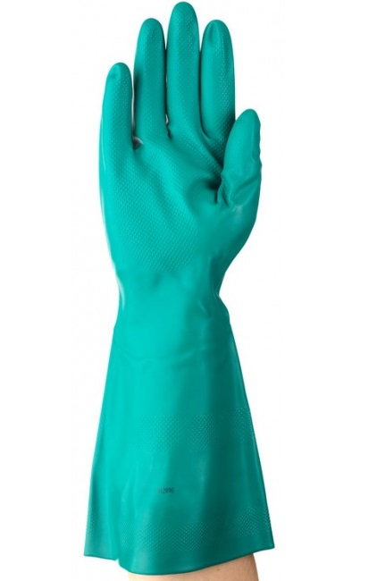 AlphaTec AquaDri® double layer design keeps hands drier longer for increased comfort and performance. Soft foam inner liner with proprietary Aquadri technology for unparalleled moisture absorption: ten times the average value of a conventional cotton velour finish. For safety, the unique nitrile film provides effective chemical protection in the event of incidental contact with alkalis, oils, fuels, some solvents, lubricants and animal fats. The diamond finish on the palm enhances wet and dry grip for optimum performance in dry and wet environments. High performance nitrile compound provides outstanding protection against lacerations, punctures and abrasions compared to natural rubber or neoprene. A fold-over cuff prevents dripping on the forearm.