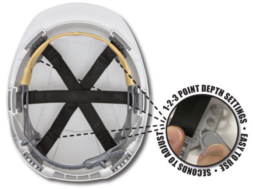 Das Textil-Gurtsystem verfügt über eine einzigartige 1-2-3-Punkt-Tiefenanpassung für höchste Passgenauigkeit bei einem Industrieschutzhelm.