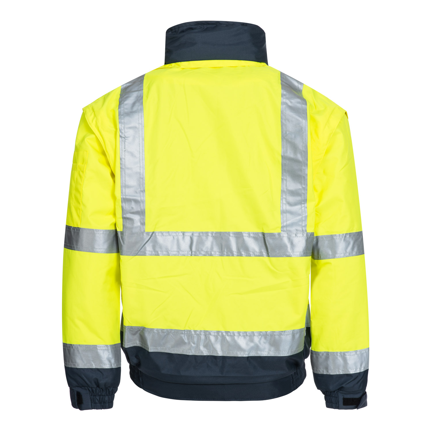 NITRAS MOTION TEX VIZ PLUS, warning protection pilot jacket, neon yellow / blue, detachable sleeves, high-quality, removable polar fleece, detachable, unlined hood, two breast pockets and two side pockets, Smartphone pocket, sleeve pocket, napoleon pocket, inside pockets, circumferential Scotchlite™ reflective 3Mstripes, 2-way zip, detachable winter hood optionally available, breast pocket with inside loop for identification pockets
