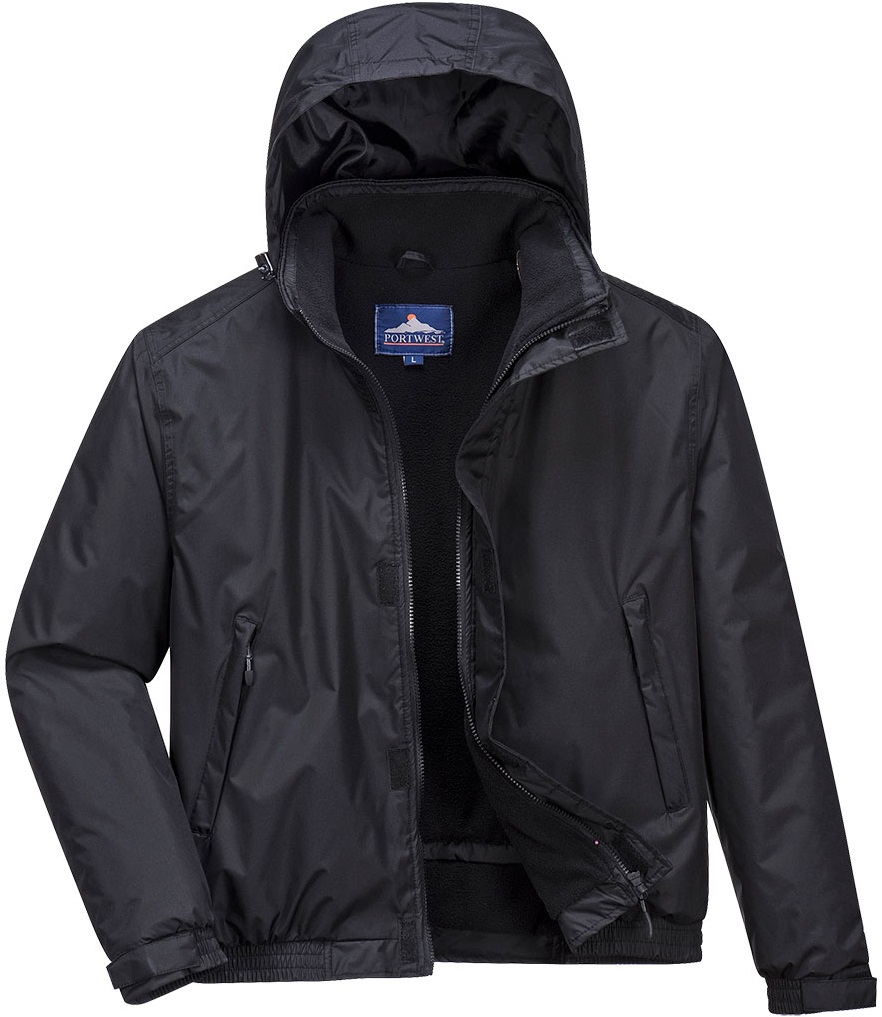 Product information This high-quality bomber jacket offers excellent protection against moisture and windy conditions. It is completely waterprooferdi, windproof and breathable. Fleece lining and lined sleeves provide optimum warmth and comfort for the wearer. The jacket has a removable hood that can be rolled into the collar, as well as zipped pockets and Velcro fastener.Rainwear The following rainwear collections offer an excellent selection of designs and colours for many users. The best quality fabrics and high-tech construction techniques have been used to guarantee the highest level of weather protection. Tested to withstand the hardnesses of daily wear. Each garment is made with care to ensure satisfaction every time it is worn.Functions Standards: EN 343 Class 3:3 Watererdiand breathable with welded seams prevents water penetration Fully lined and padded to stop heat from outside and keep heat inside Fleece lining for extra warmth and comfort 4 pockets for sufficient storage sp