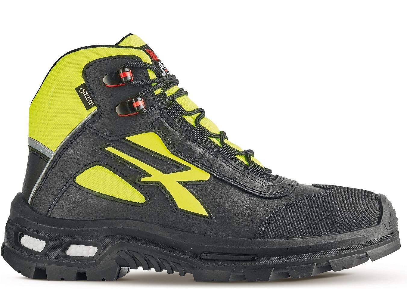 Hoher und bequemer Sicherheitsschuh aus der Red Over-Linie von U-Power, Obermaterial aus weichem Narbenleder, Textileinsätze und Zehenschutzkappe aus Verbundmaterial, Gore-Tex-Futter und Sohle aus weichem PU-Schaum und Infinergy®.