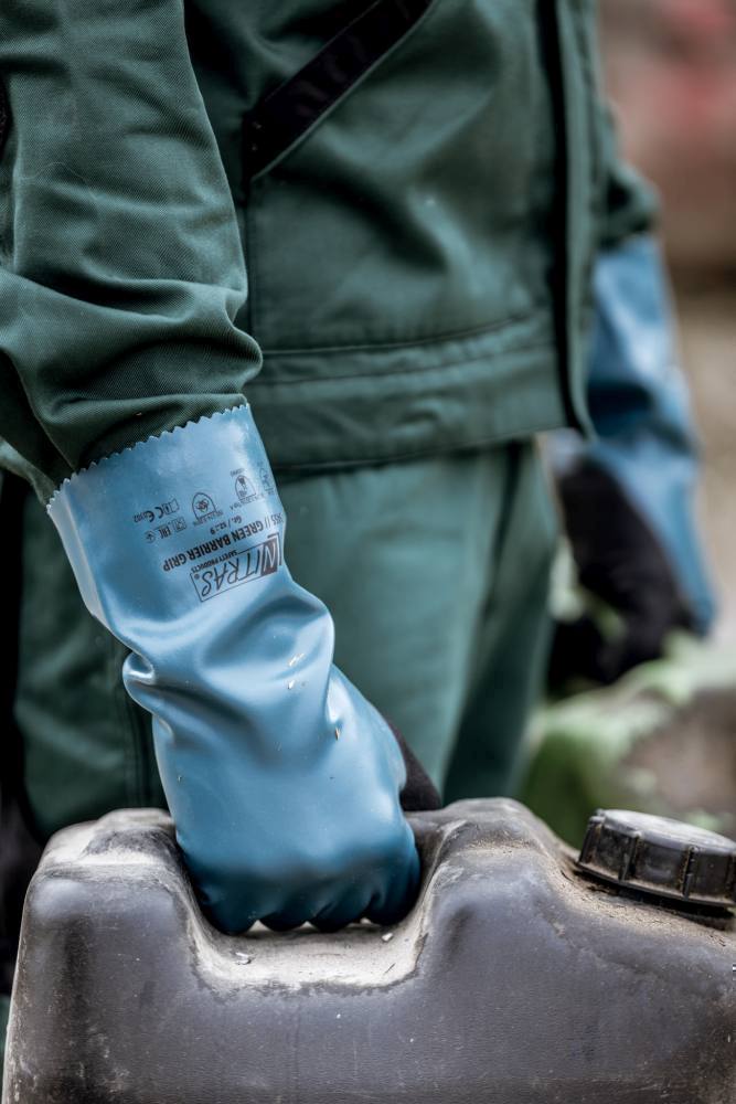 NITRAS GREEN BARRIER GRIP, Chemikalienschutzhandschuhe, Baumwoll-Trikot, naturfarben, mit zweifacher Beschichtung, untere Beschichtung: Nitril, grün, vollbeschichtet, untere Beschichtung: Gesandetes Nitril, schwarz, teilbeschichtet auf Innenhand und Fingerkuppen, Länge 32 cm, sehr guter Trocken- und Ölgriff, für Lebensmittelkontakt
