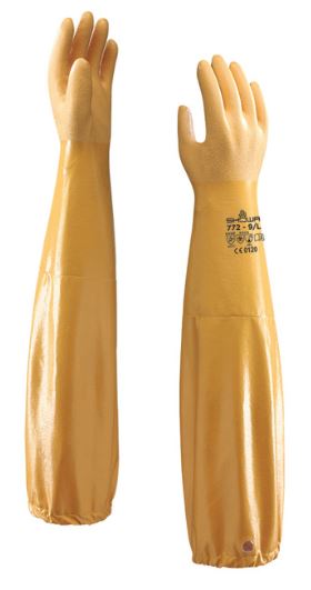 Der äußerst haltbare Handschuh SHOWA 772 bietet einen erweiterten Schutz des gesamten Arms vor Gefahren. Eine vollständig beschichtete, undurchlässiger Nitrilstulpe und eine zusätzlich nitrilbeschichtete Handfläche schützt gegen Öle, Abnutzung und Chemikalien. Ein elastischer Rand hält den 772 an Ort und Stelle, und seine antibakteriellen und geruchshemmenden Eigenschaften sind ideal für längeres Tragen. Die Kombination aus einer rauen Grifffläche und Flexibilität gewährleisten Fingerfertigkeit und Präzision.