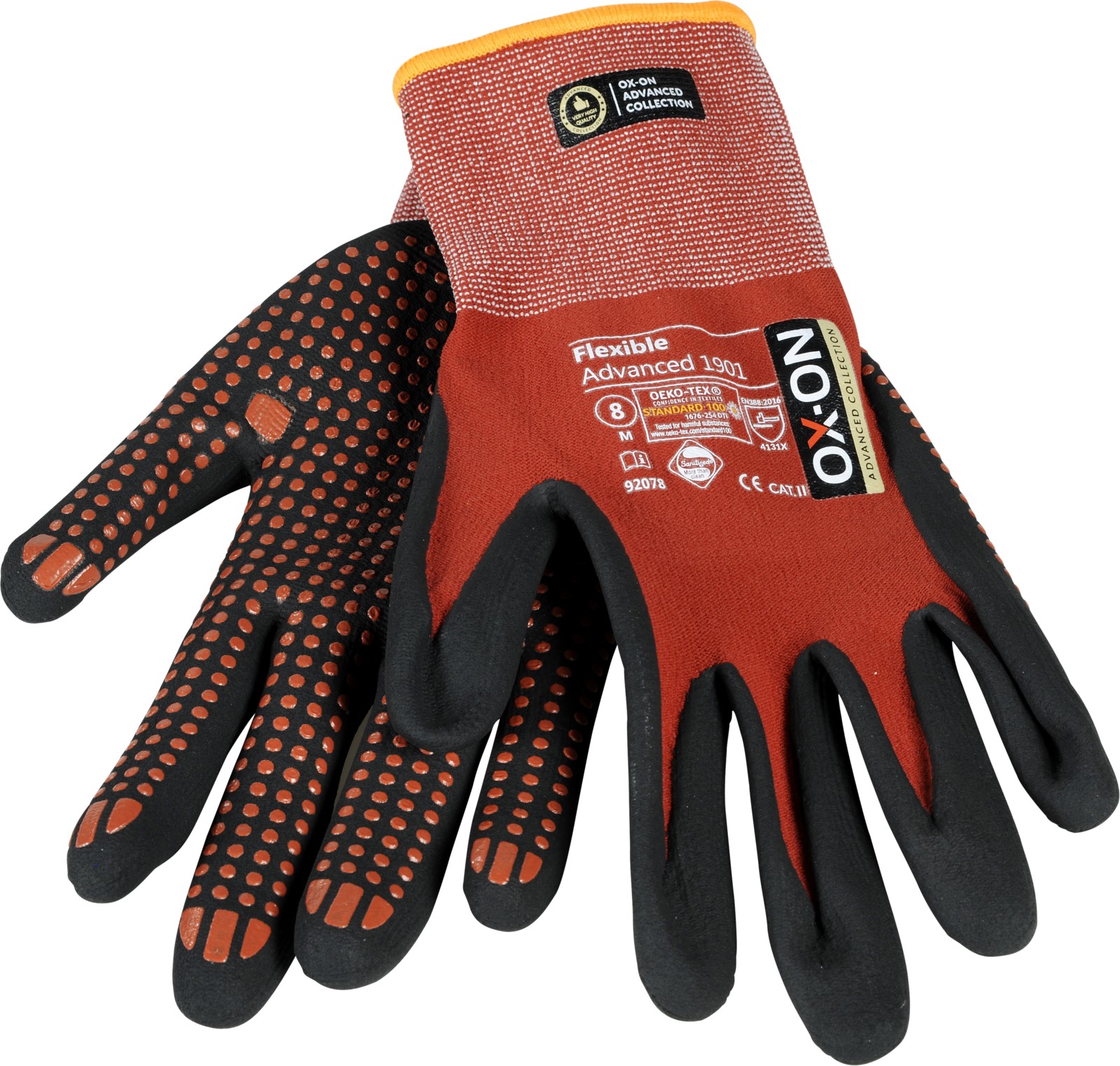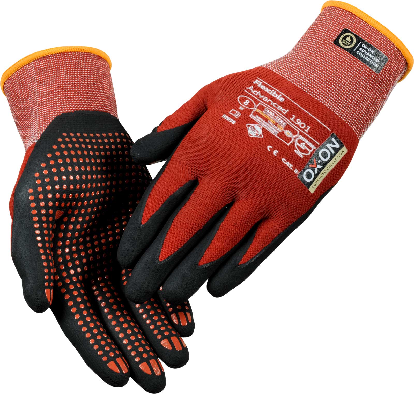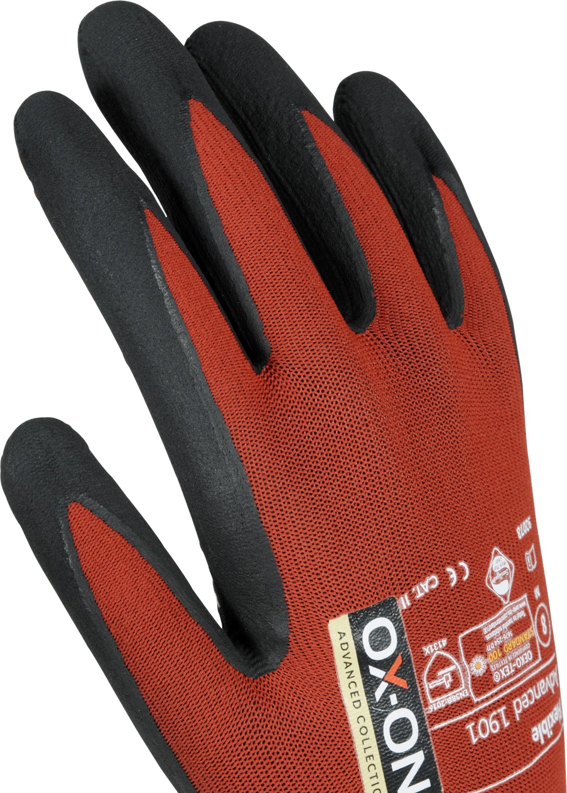 OX-ON Flexible Advanced 1901 ist ein Arbeitshandschuh von höchster Qualität mit Noppen auf der Handfläche, um Ihnen einen noch besseren Halt in trockenen und nassen Umgebungen zu ermöglichen. Der Handschuh ist extrem langlebig und passt, als wäre er für Ihre Hand gefertigt worden. Die Passform ist herausragend und verspricht durchgängigen Tragekomfort – unabhängig von Ihrer Tätigkeit. Das Gewebe des OX-ON Flexible Advanced 1901 besteht aus Nylon und Elasthan. Somit bietet er Ihnen einzigartige Atmungsaktivität bei unübertroffener Flexibilität und Komfort. Die Handfläche und die Finger sind mit einem speziellen Nitrilschaum beschichtet, der ein hervorragendes Tastempfinden und einen präzisen, sicheren Griff ermöglicht. Der Advanced 1901-Handschuh ist OekoTex zertifiziert. Dies ist Ihre Garantie dafür, dass der Handschuh keine gesundheits- oder umweltgefährdenden Chemikalien oder Farbstoffe enthält. Darüber hinaus ist der Handschuh mit Sanitized behandelt, wodurch er sich länger frisch anfühlt und Sie vor Keimen und Schweißgeruch schützt. Ein besonderer Handschuh der Extraklasse!