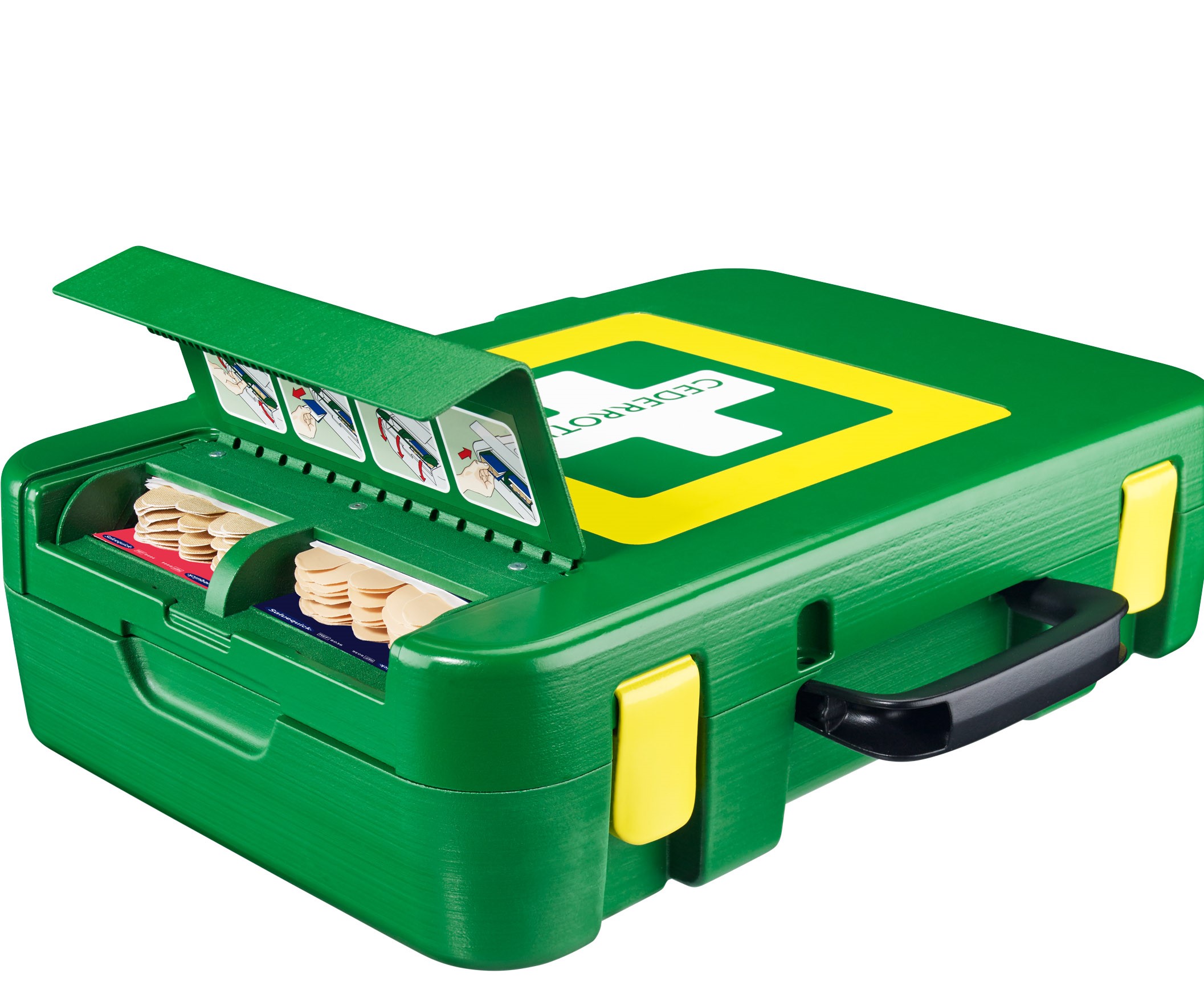 Dabei bleibt der Inhalt des Koffers unberührt und hygienisch sauber. Im Kofferinneren sind die Produkte übersichtlich in Fächer eingeteilt. Auf diese Weise ist es leicht, das richtige Produkt zu finden – gerade, wenn jede Sekunde zählt. Im Deckel befinden sich u. a. Handschuhe, Atemschutzmaske und Schere. Alle Produkte von Cederroth sind mit deutlichen, selbsterklärenden Anweisungen versehen. Pfiffige, rote Refill-Aufkleber im Koffer zeigen an, wenn ein Produkt nachgefüllt werden muss. Der Koffer kann auch an der Wand befestigt werden und ist auf diese Weise immer zur Hand.