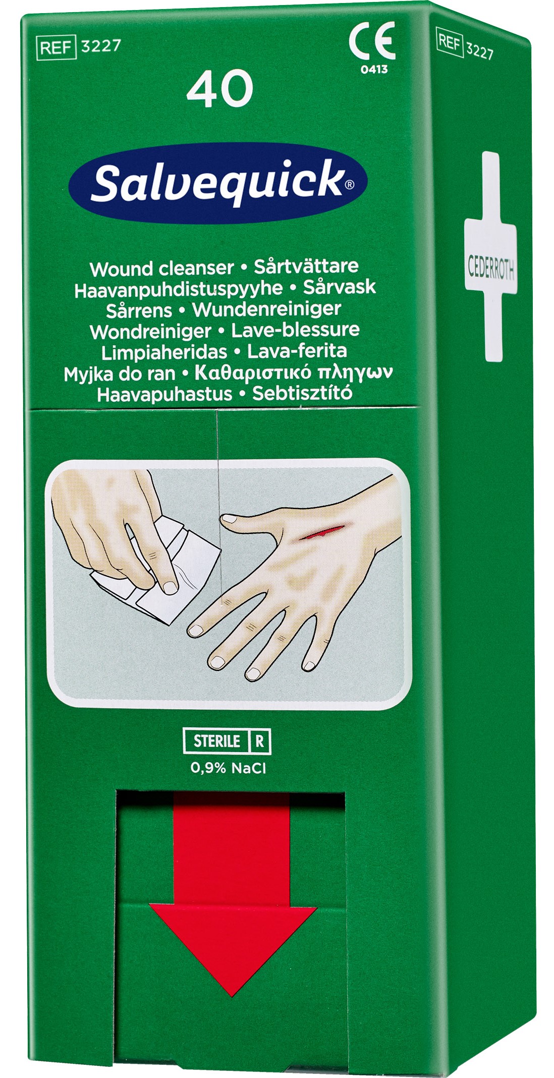 Inhalt: 40 x Salvequick Wundreiniger 11 x 12 cm (Sterile physiologische Kochsalzlösung)