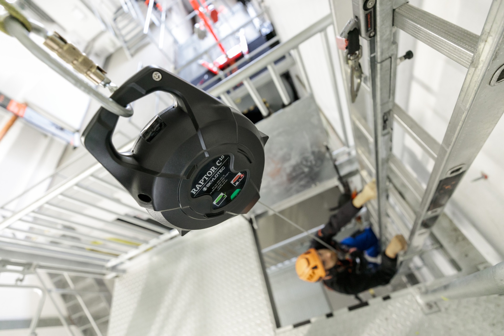 Das Höhensicherungsgerät RAPTOR CS mit selbsteinziehbarem Edelstahlseil und automatischer Blockierungsfunktion ermöglicht sicheres Arbeiten in der Höhe und Tiefe. RAPTOR CS ist modular aufgebaut, sodass alle Bestandteile einzeln ausgetauscht werden können, was Revisionszeiten und Instandhaltungskosten senkt. Ein energieabsorbierender Einlaufdämpfer schützt das Gerätegehäuse und die innenliegende Mechanik, sodass kontinuierlich auftretende Schläge reduziert und Handverletzungen beim Seileinzug ausgeschlossen werden können. Das Höhensicherungsgerät verfügt über zwei für den Anwender sichtbare Fallindikatoren, welche die Funktionsfähigkeit des Gerätes bereits von außen anzeigen. Eine rote Anzeige warnt den Anwender, sobald das Gerät überprüft werden muss. Der Nutzer wird so vor einem nicht mehr einsatzfähigen Gerät geschützt und es kann zusätzlich Zeit bei der jährlich vorgeschriebenen Revision gespart werden. Die durchdachte Gehäusekonstruktion ermöglicht zudem eine platzsparende und gerätschonende Lagerung.