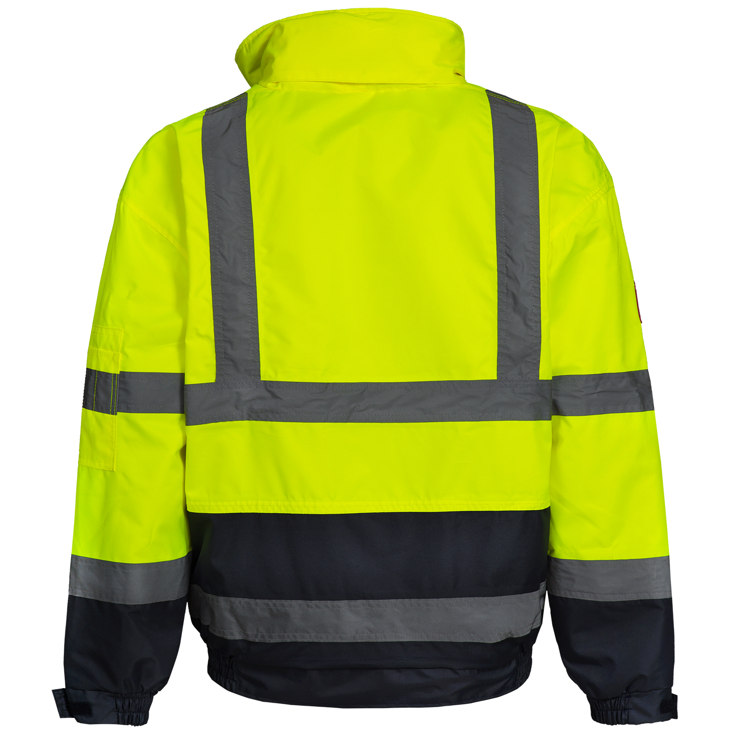 NITRAS MOTION TEX VIZ, Warnschutz-Pilotenjacke, neongelb / blau, einrollbare Kapuze, Brust- und Seitentaschen, Smartphone-Tasche, Ärmeltasche, Innentasche, umlaufende Reflexstreifen, Brusttasche mit Schlaufe für Ausweishüllen