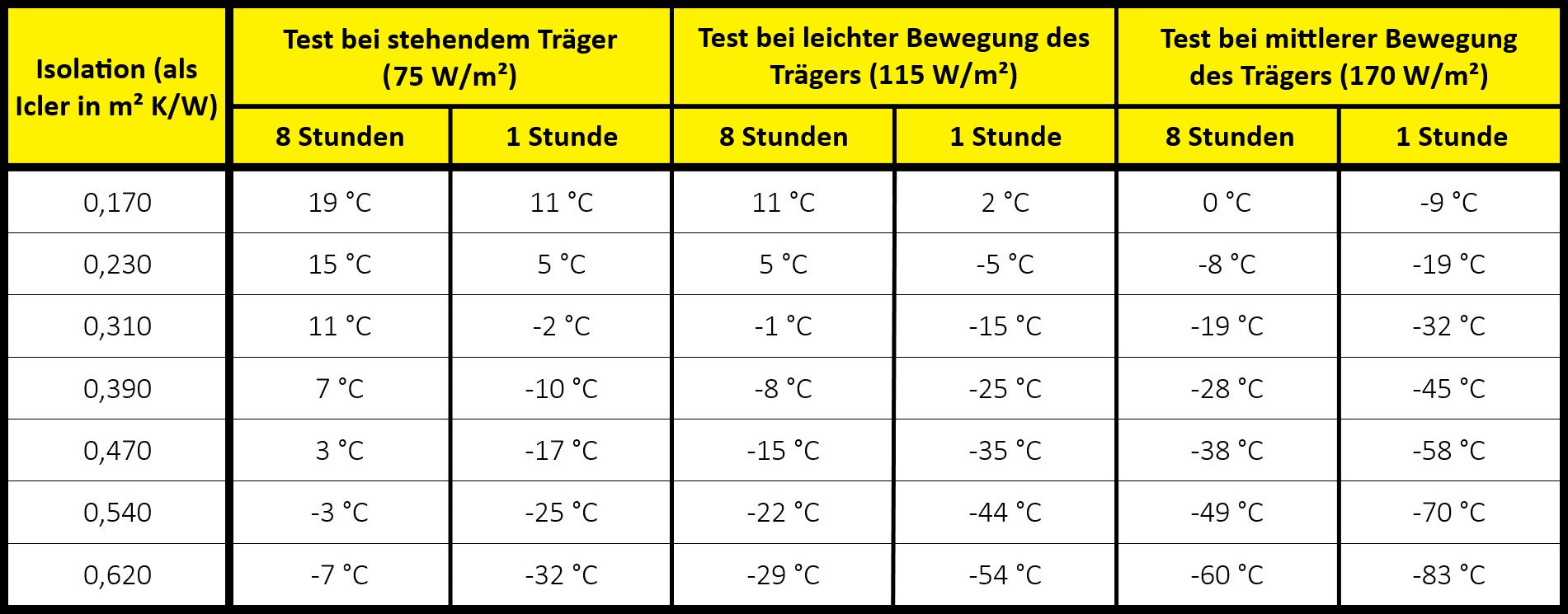 Die Wärmeisolation wird wie bei der EN 14058 als Icler-Wert angegeben und anhand einer statischen oder sich bewegenden Puppe geprüft. Der Icler Wert gibt an, vor welcher Umgebungstemperatur ein Kleidungsstück bei verschieden langen Tätigkeiten, entweder stehend oder in Bewegung, schützt. Ein Icler-Wert von 0,390 würde bedeuten, dass der Träger dieser Kleidung beispielsweise bei leichter Bewegung 8 Stunden lang vor Temperaturen bis -8 °C geschützt ist. Alle weiteren Werte können Sie aus folgender Tabelle ablesen.